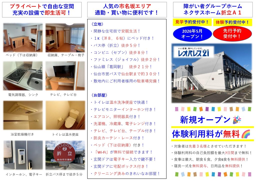 この度、令和8年5月1日に障がい者グループ「ネクサスホーム折立」がオープンします!